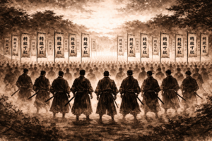 挿絵3:遠目、集団。戦の前のような。幟が17本立っている