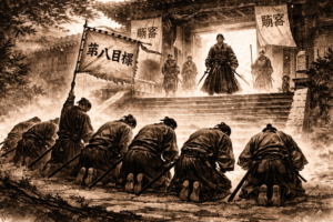 挿絵5:城の者に、集団が礼をしているイメージ→第八目標の旗を持たせる