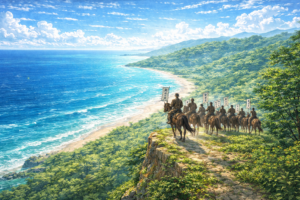 挿絵7:俯瞰、画面右下に集団がいる崖あり。画面右手前に森、左奥に海を眺める。穏やかな風が吹くイメージを